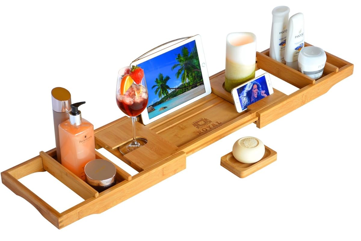 It is water resistant and easy to clean. It allows you to easily have a drink and a device safely installed while in the tub. This royal craft wood natural bamboo bathtub caddy appears on the february ellen's list. The central tray is fitted with a wooden rack to hold up your book or tablet. 1.5'' h x 8.8'' w x 29.3'' d;